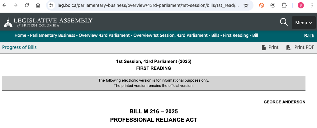“The Select Standing Committee on Private Bills and Private Members’ Bills is seeking public input on Bill M 216, Professional Reliance Act.